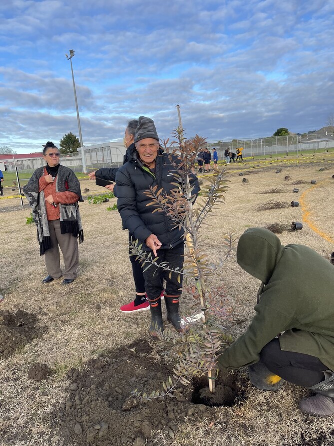The school has been working with local designer Colin James (Ngāti Kahungu, Ngāti Tūwharetoa) who created the layout. They converted an underused soccer field and planted it in native trees. There is a clearing in the middle with power cable laid so that in the future it could be used for weddings, funerals, kapa haka and band performances. In the years to come, the ngahere will be an asset for the community and the school whānau is proud of the legacy project they have created.